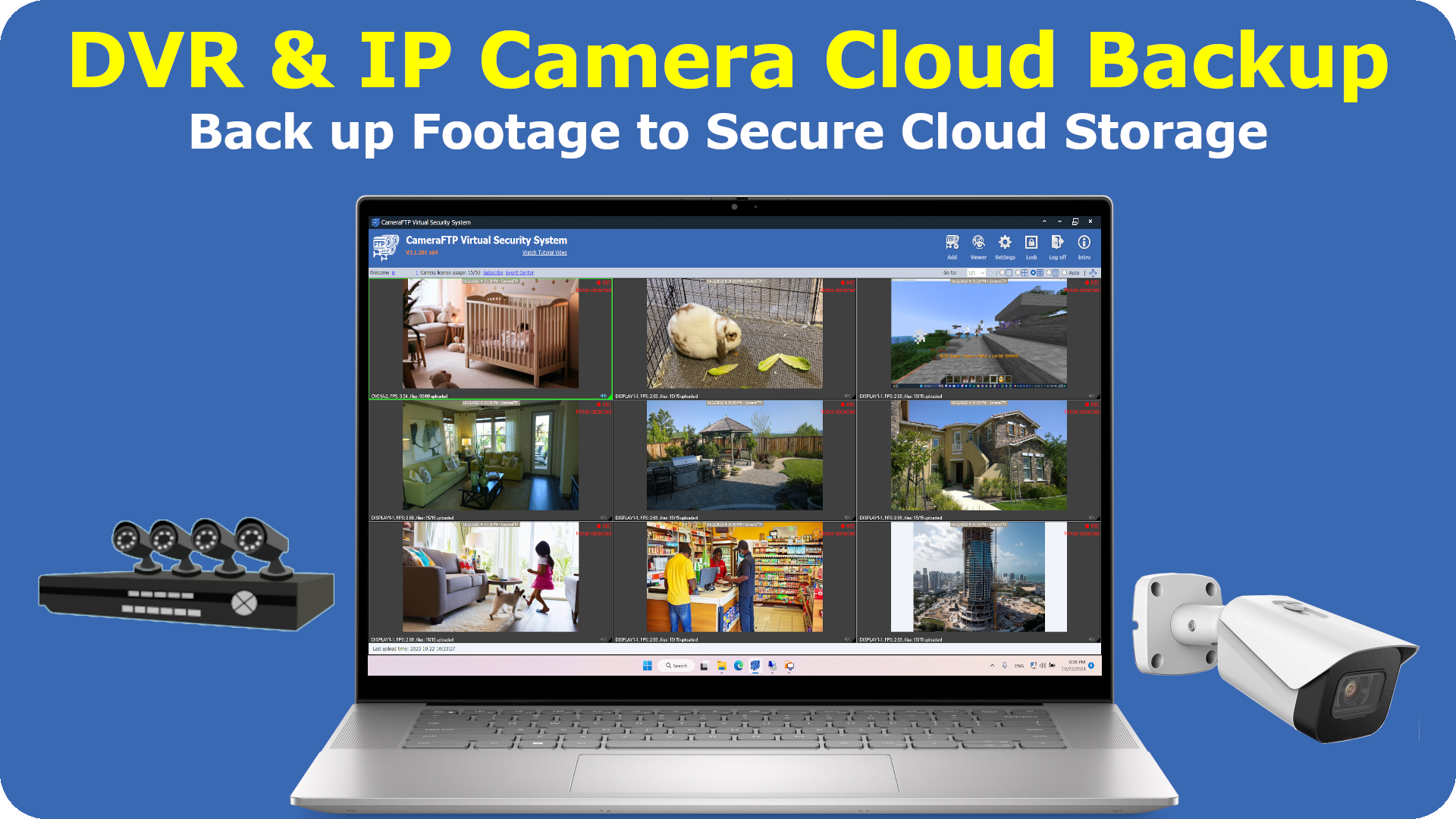 • Regular DVR features: record footage on CameraFTP cloud storage (and local disk);