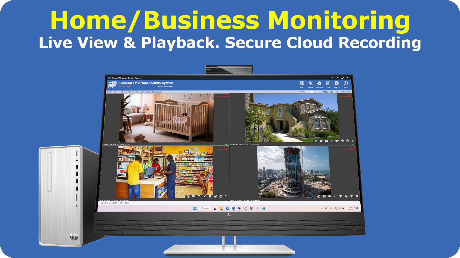 CameraFTP VSS is a powerful video surveillance program that can turn a PC/Laptop into a CCTV / DVR security system. It can display the live scenes on a monitor, and record the footage to the cloud. You can view or play back the footage anywhere, anytime. VSS also offers powerful screen recording features for monitoring computer usage, recording online classes/meetings, TV shows and games.