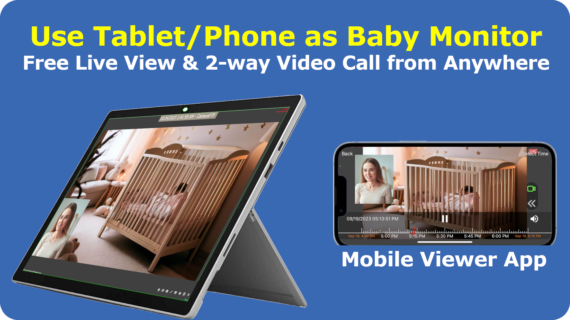 Use Tablet/phone/laptop/PC+Webcam as Baby Monitor or IP Camera.