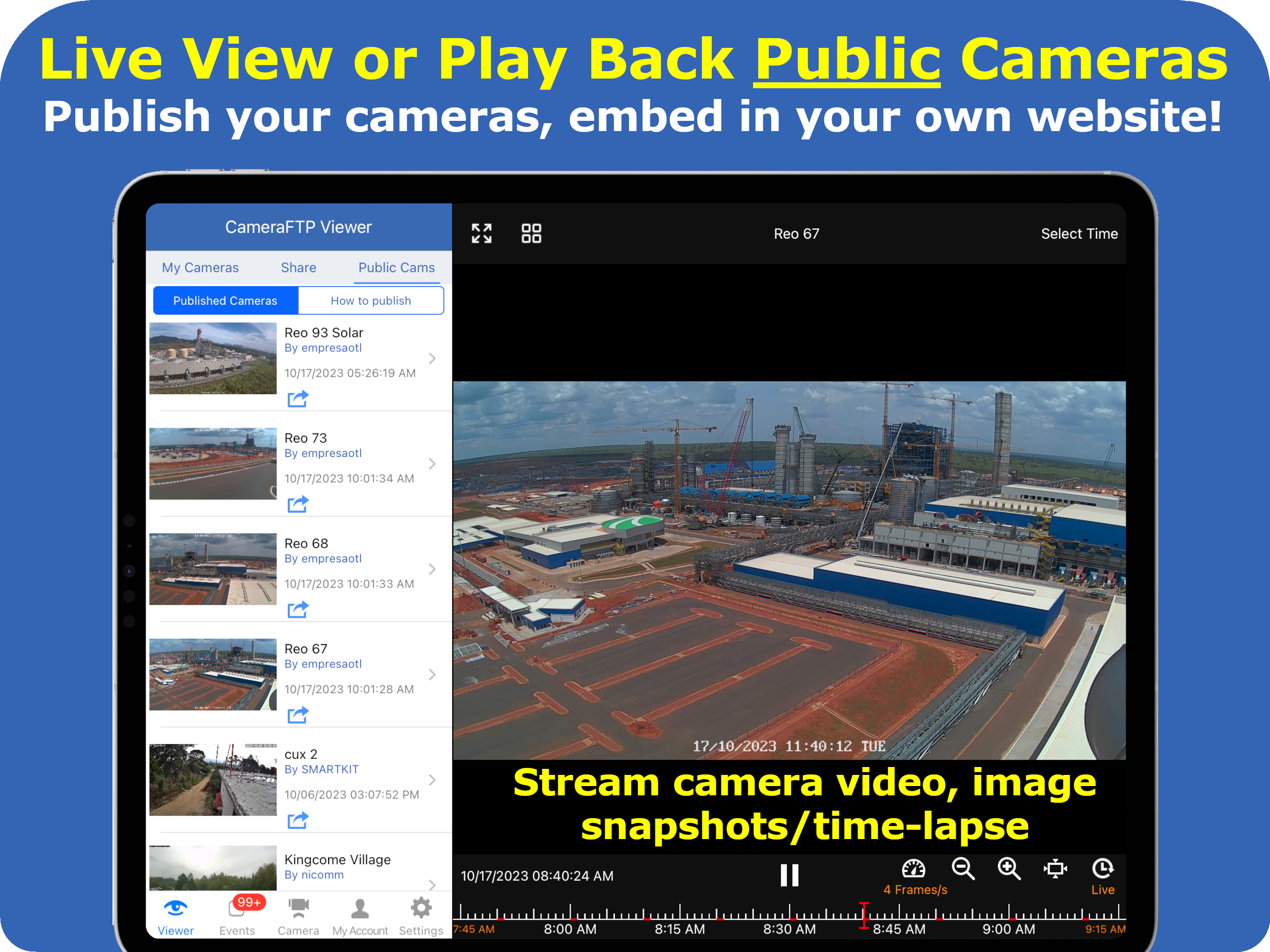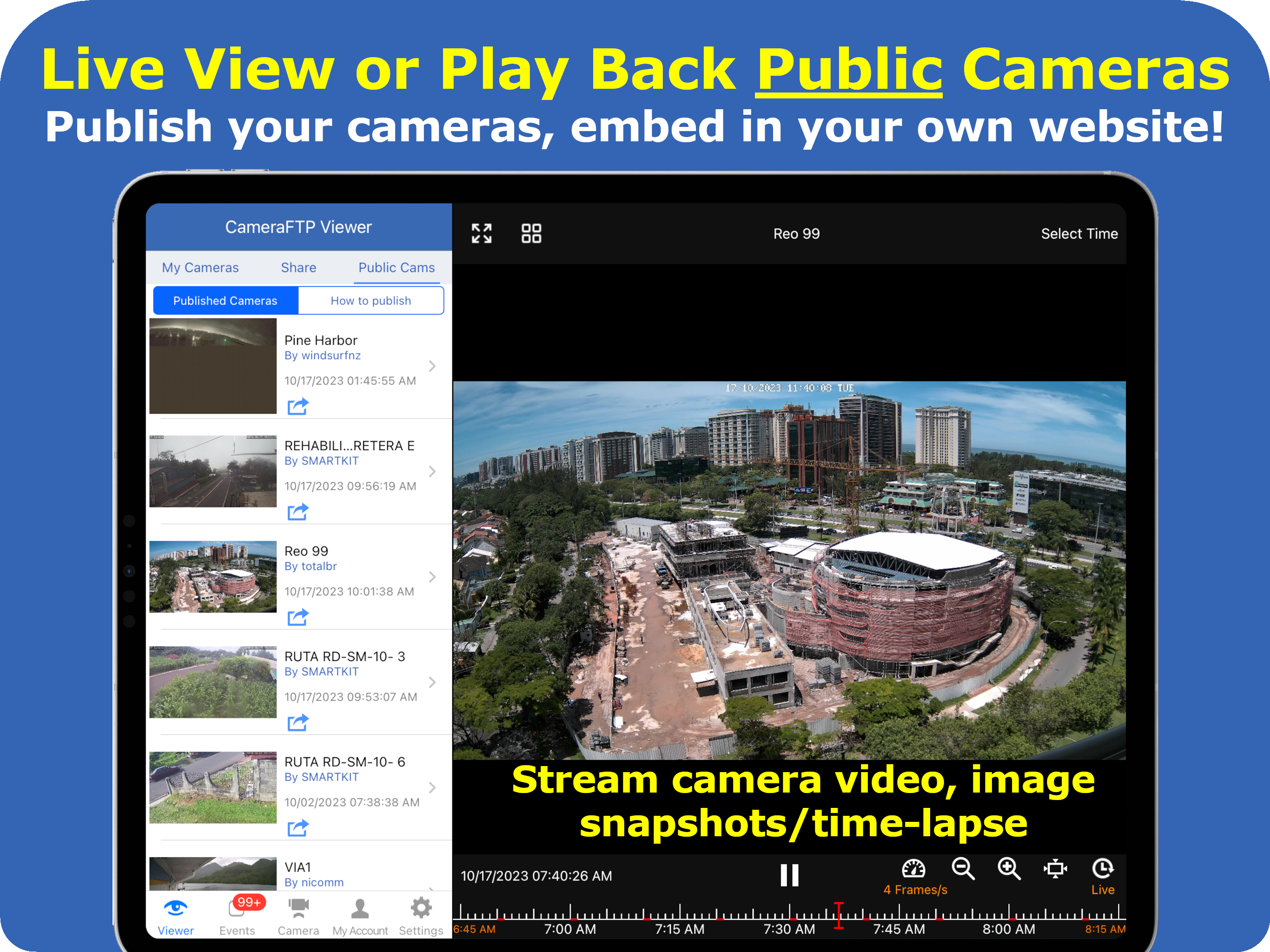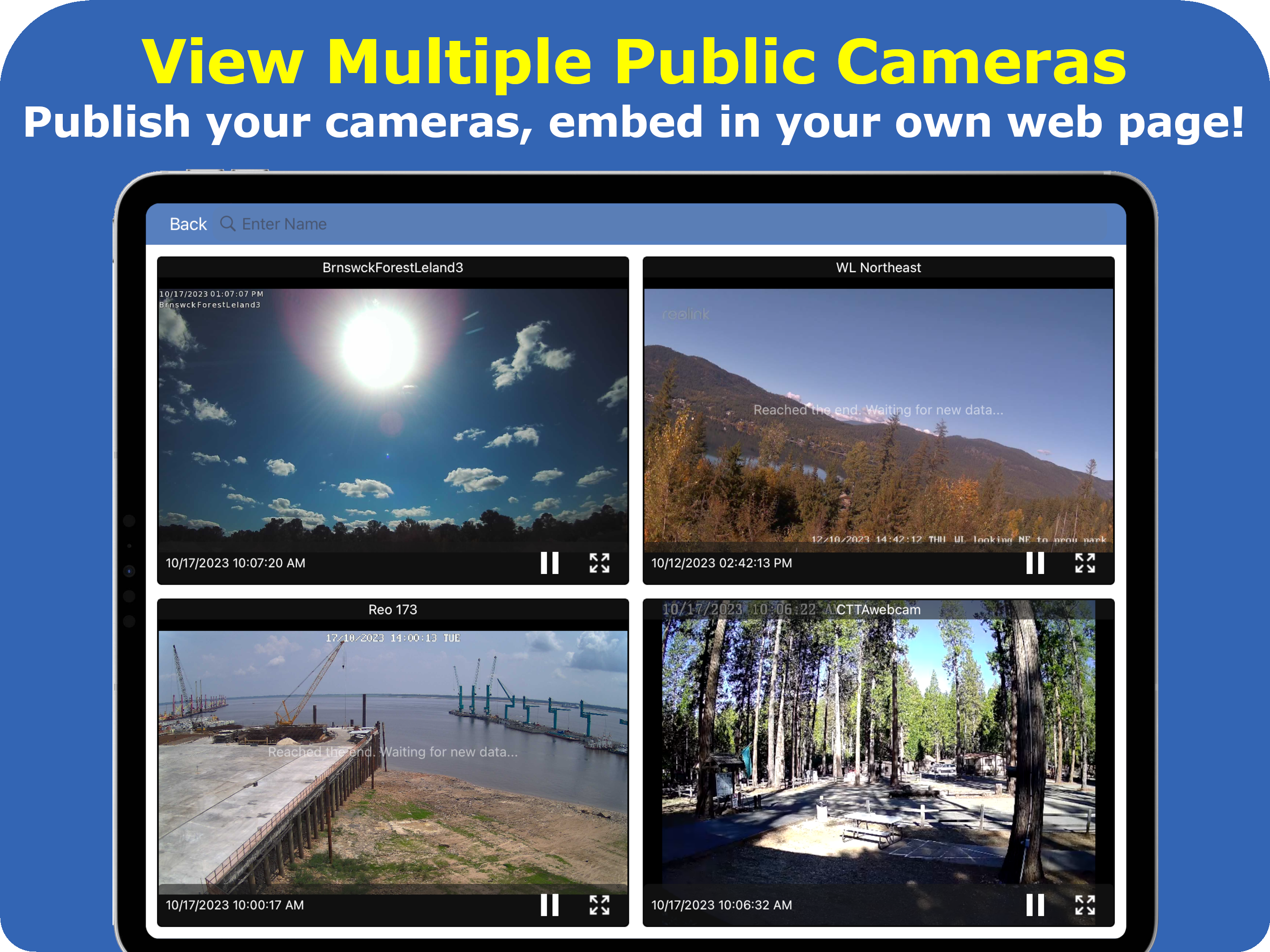 The viewer APP can play image-recording cameras and (most) video-recording cameras. It can play multiple cameras at the same time. You can also view cameras shared or published by other people.