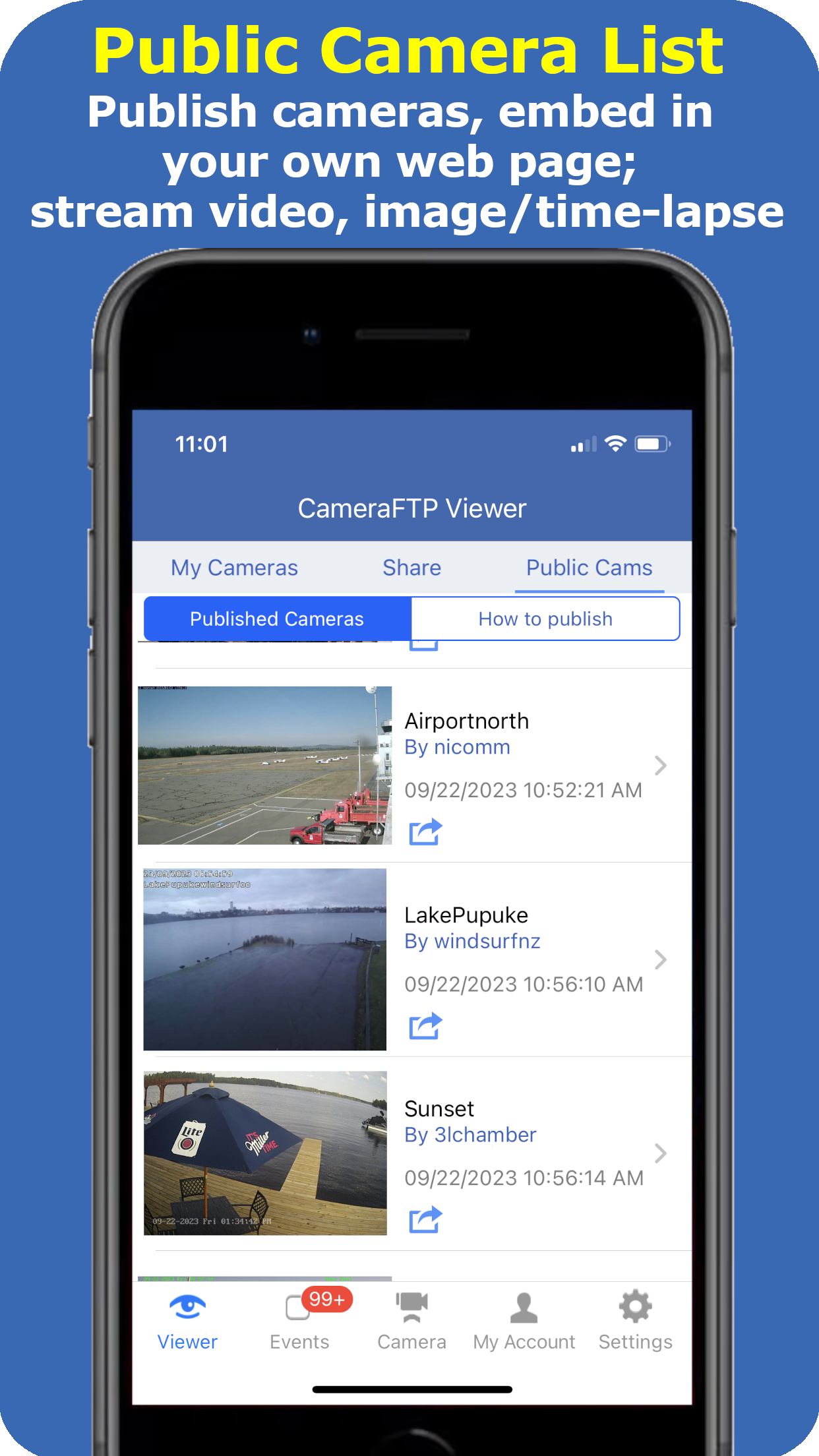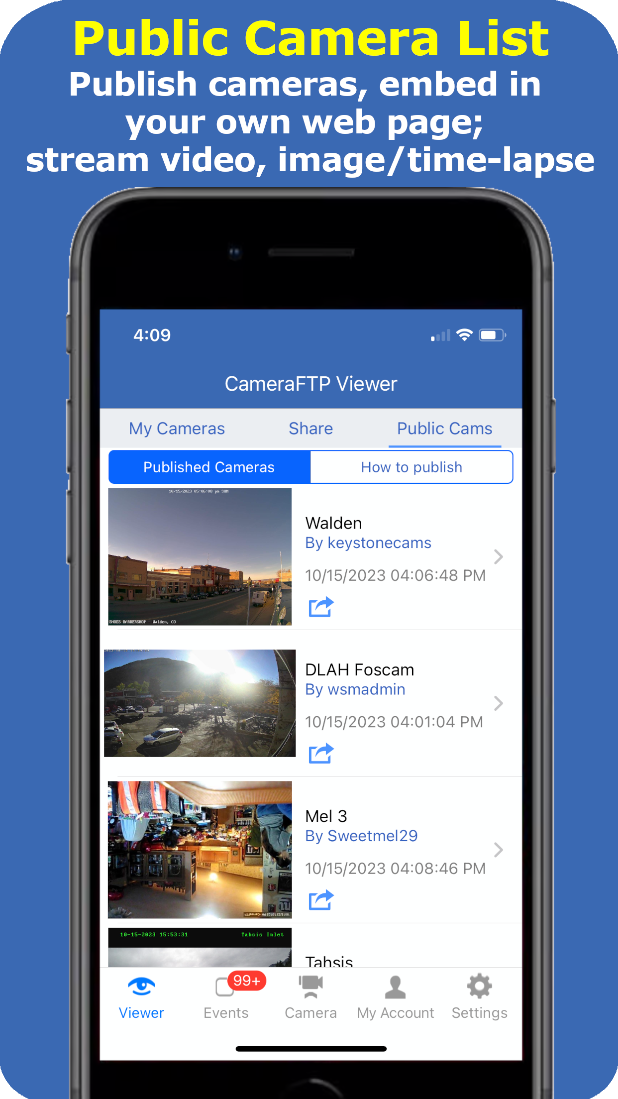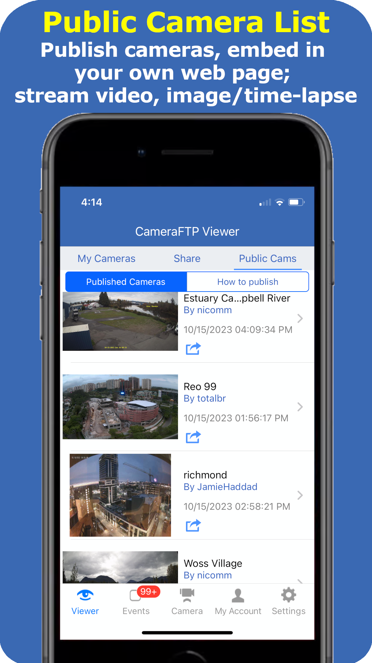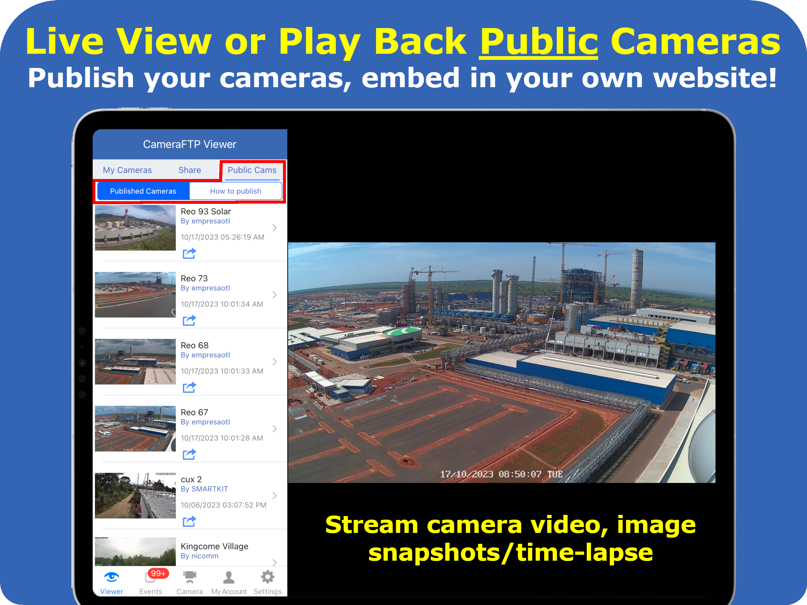 The viewer APP can play image-recording cameras and (most) video-recording cameras. It can play multiple cameras at the same time. You can also view cameras shared or published by other people.
